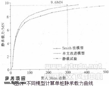 4.4 桩的极限静承载力预测分析 用ADP程序对桩在设计贯入深度26.48m处进行了单桩极限承载力预测分析。图11为两模型预测桩的极限承载力曲线。由图11分析,在贯入30cm时击数在0~20击范围内,两模型预测的单桩极限静承载力基本一 致;当贯入30cm大于20击时,本文改进模型的预测值逐渐大于Smith法模型的相应值。复打贯入30cm实测锤击数为300击,Smith法模型、本文改进模型的预测值分别为8.861MN、9.442MN,而根据静载试验得到单桩的极限承载力为9.6MN。两模型计算结果与试验值的相对误差分别为7.7%、1.6%。二者的计算结果均满足工程精度要求,但改进模型的预测值的精度优于Smith法模型,更接近于实测结果,可用于实际打桩工程中单桩极限静承载力值预测分析。