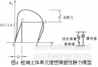 2.2 桩端土体模型 桩端土体单元用理想弹塑性模型来描述土体力学与变形特性,即弹性、塑性与动阻力分别由弹簧、摩擦键及缓冲壶组成的土体流变模型来模拟(图4)。土体单元的加载弹性变形由线段OC(弹簧)模拟,塑性变形由线段CD(摩擦键)来模拟,DE段表示桩
