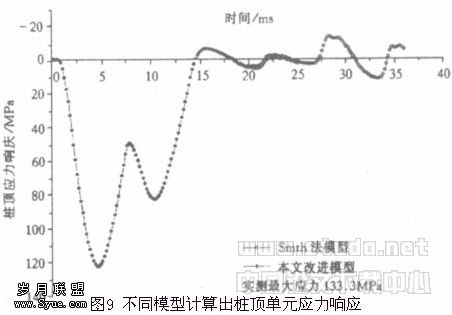 由图9分析,在0~15ms范围内两模型分析得到的在一次锤击过程中桩顶单元应力响应的时程曲线基本一致,在t>15ms时,本文改进模型所得的应力值略小于Smith法。两模型得到 的最大值均为120.1MPa,略小于实测最大值133.3MPa,误差约为10%,满足精度要求。