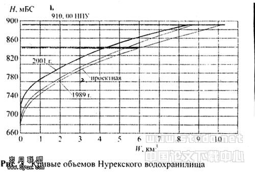 水库的淤积和库岸变化的过程,取决于水库库容变动的动力,首先是有效库容,这个问题很复杂,研究的还不够,还没有一个可靠的预报。采用海洋水深法分析,由于很费事,所以很少采用。因此,在水力枢纽运用期所有的计算,一般还是利用过去的库容—水位关系曲线。其中,1989年以前利用1972年的库容曲线,后来到2002年以前,利用1989年的库容曲线。所有这类的计算结果,准确性都是很低的。取1987年努列克水库水量平衡作为举例,列于表3中。可以看出,有大于10亿立方米的库容不吻合。因此,在这种条件下不可能利用数学模型进行任何优化计算。