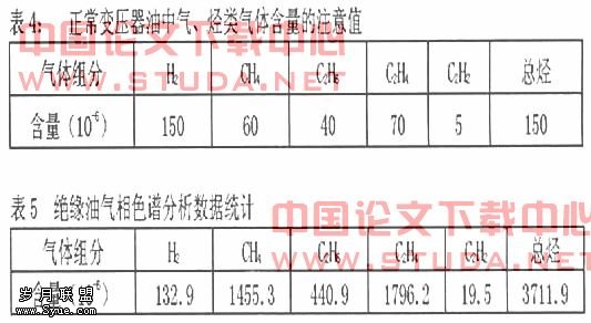 由于温度、湿度、外电场、磁场、试验仪器、试验电源等多种外界因素的作用,对试验值的影响较大,造成试验数据的误差和波动。将历年春检中的试验数值换算至同一温度,从表3可以看出,虽然各项试验数据在规定范围内,但通过比较可以发现,2007年度,该变压器的高压对低压、高压对地、低压对地和高压对低压线圈间的绝缘电阻及吸收比突然下降。其直流泄漏电流增大,而变压器高、低压线圈的介质损耗tgδ值无明显变化,且符合规定。由此可初步判断线圈绝缘存在较严重的集中缺陷,但仅依据常规的绝缘试验,并不能足以说明变压器内部有异常,通过绝缘油气相色谱分析数据,见表5。