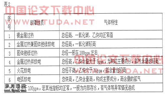 由于变压器内的油和固体绝缘材料在电或高温的作用下裂解产生各种气体,进行绝缘油气相色谱分析试验分析这些气体各种成分,有助于判断运行设备的状态。对判断故障有价值的气体有甲烷、乙烷、乙烯、氢、一氧化碳、二氧化碳。正常运行的老化过程产生的气体主要是一氧化碳和二氧化碳。在油质绝缘中存在局部放电时,油裂解产生的气体主要是氢和甲烷。在故障温度高于正常运行温度不多时,产生的气体主要是甲烷。随着故障温度的升高,乙烯和乙烷逐渐成为主要特征。在温度高于1000℃时,油裂解产生的气体中含有较多的乙炔。如果故障涉及到固体绝缘材料时,会产生较多的一氧化碳和二氧化碳。根据绝缘油中溶解的气体的组分和浓度含量,可以判断变压器内部可能存在的潜伏性故障。在实际中,根据烃类气体、氢气、一氧化碳、二氧化碳这几种气体特征来判断故障性质。如表2所示: