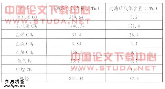 检修人员首先对瓦斯继电器内的气体进行了分析,此气体为淡黄色且可燃,这说明变压器内部肯定有故障,随后对主变的分接开关进行检查发现,分接开关的位置出现变动,前一次调整的位置在+1档,而实际位置却在+1档和+2档之间。然后对主变进行了绝缘电阻、直流电阻和绝缘油的耐压、色谱分析试验,通过对比,有两项试验结果不合格,一是分接开关在+1档位的接触电阻测试不出,二是对变压器的绝缘油进行色谱分析后,绝缘油中的乙炔(C2,H2)、氢气(H2)、总烃含量均超过了规定值,根据《电力设备预防性试验规程》规定:C2H2>5 PPm、H,>150 PPm、总烃>150 PPm时应引起注意。检修人员将变压器内的油放空后,进入变压器内对分接开关进行检查后发现,分接开关+1档的两个触头表面有放电和少许烧伤的痕迹,对表面进行打磨处理,上好定位销后重新测试接触电阻,+1档的接触电阻为:AO=1.229、BO=1.227、CO=1228(测试温度为14℃),直流电阻符合规程要求。将绝缘油注入变压器,用真空滤油机对绝缘油进行了自循环过滤,重新作了绝缘油色谱分析试验,此时油中乙炔、氢气、总烃值符合标准。将变压器投运后,一切正常。过滤前后绝缘油中的气体含量见下表:
