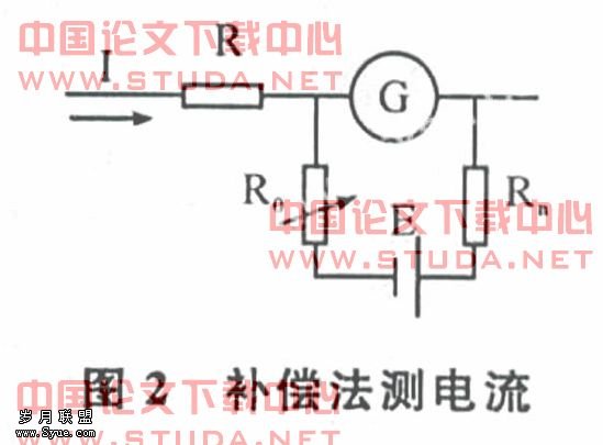 待测电流电路如图所示。为了不改变电路状态而实现对电流的测量,还可利用“电流补偿”原理,结合电位差计测电压的方法,实现对电路电流的测量。Rn为己知标准电阻,选择电源电压E并调节电阻R0使电流计G指示零电流值,用电位差计测得标准电阻Rn上的电压降Vn,即可得电流I=Vn/Rn。
