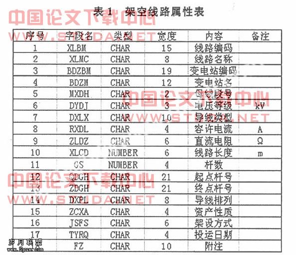 以本文配电网图层中架空线路属性表为例来说明配电网规划GIS各表的数据格式、结构,线路属性表的基本内容如表1所示。
