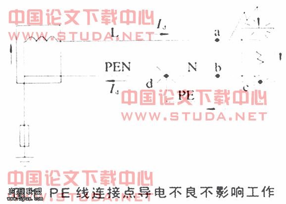一旦发生接地故障,由它引起危险电弧的几率也远大于带电导体间产生危险电弧的几率,这可用图1来说明。图中a、b、c和d各为相线、中性线和PE线的连接端子。a、b两端子如连接不良或不导电,设备将不运转或运转不正常,可及时觉察予以修复,不致引发事故。但PE线的端子c、d不导电或导电不良却不易觉察,因设备仍能照常运转,这时c、d端子的连接不良将成为一个事故隐患而持续存在。若一旦发生图1所示碰外壳接地故障,如果c、d端子不导电,设备外壳对地带相电压而导致电击事故。如果c、d端子导电不良,端子处将进发电火花或电弧(延续和集中的电火花即为电弧),很易引起火灾。