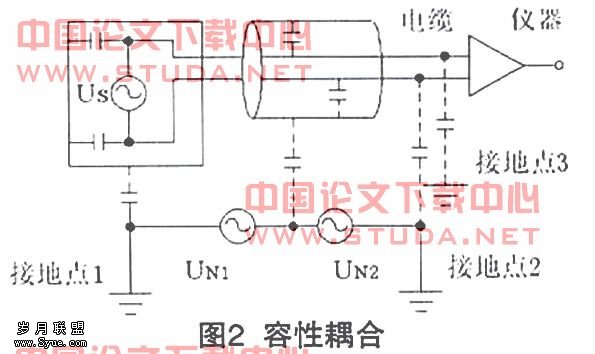 如图2所示,弱电系统每部分之间存在电容,任何电压的变化,不管在什么位置,将驱动电流通过电容而传导干扰,产生的干扰电流为: