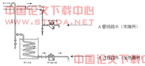 过程疏水如图二所示,“过程疏水”与管线疏水有所不同,管线疏水是不参与蒸汽工艺过程的(并联应用),而过程疏水是参与蒸汽工艺过程的(串联应用),疏水器在过程疏水中它的性能指标有时会决定整个设备或系统的主要性能和指标(如热交换器、加热器、暖风器等疏水系统)。如疏水不及时则造成冷凝水积存,进而影响热量的交换,及时将这些设备的过程疏水可直接回收到凝汽器热井中,这样不仅节约了水资源,同时也提高了经济效益。由此可见过程疏水是非常必要的。