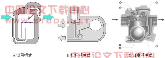 以前,发电厂中的应用较多的是机械式疏水器及热动力式疏水器。机械式疏水器工作原理是基于“阿基米德定律”,当有凝结水时浮子向上浮起,打开阀嘴排放冷凝水,反之则落下关闭阀嘴使蒸汽不能通过。最早的机械式疏水器的浮子是敞开式的,象一个倒吊的“桶”因而被人们称做“倒吊桶式”疏水器(如图三A)。由于浮子的敞开,每次状态的转换都要等桶中的介质更换以后才开始动作,所以这种疏水器动作迟缓、响应慢,容易产生冷凝水的积存。此外该疏水器结构具有复杂的“杠杆- 铰链”系统,由于经常处于运动中且温度交替变化,故障率较高,使用寿命受到限制。