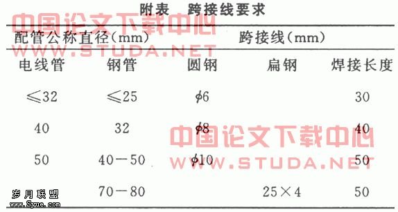 前期配合土建上结构,要认真按图进行预留、预配、预埋,地下室的配合尤为重要,该工程地下室为人防工程,电气施工应按人防工程电气施工规范的规定进行。该层设备多,涉及系统多、配管前须做好各种准备工作,弯管的加工、要严格按施工规范规定进行弯制,埋在混凝土内的其弯曲半径不得小于管径的10倍,弯扁度不得大于管外径的十分之一。配管为套管包焊连接时,其管连接应采用加套管包焊,所有套管要适宜,其长度为所配管管外径1.5~3倍,所有焊缝均要焊牢、饱满,确保严密。丝扣连接时,管端套丝长度不应小于接头长度的1/2,在管接头两端应焊跨接地线,跨接线要求见表1:?