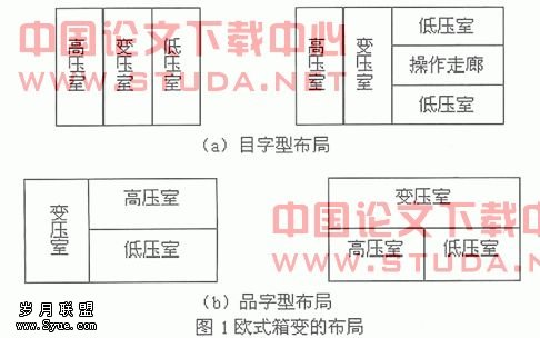 欧变的高压室、变压器室和低压室可按“目字型”或“品字型”布置。“目字型”布置与“品字型”布置相比,“目字型”接线较为方便,故大都采用“目字型”布置。如图1所示: