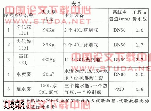 我国规范规定,变压器室和高低压电气设备间多采用卤代烷1211、1301或CO2全淹没系统进行保护。几乎每座建筑都有这两种场所,因此在这两种场所中卤代烷或CO2的使用量相当可观,也是哈龙替代的重点。一般这两种场所的容积较小(200~500m3)、封闭性较好,除变压器和电气柜外无其它可燃物品,非常适合细水雾系统的使用。根据资料,以一台1000KVA室内变压器(外型尺寸2230′1595′2610mm,油重1485Kg,变压器室7′7′5.1m)为例,分别采用卤代烷1211、1301、高压CO2、水喷雾和细水雾系统保护,灭火剂用量及工程造价对比情况见表2(不计入报警系统)。