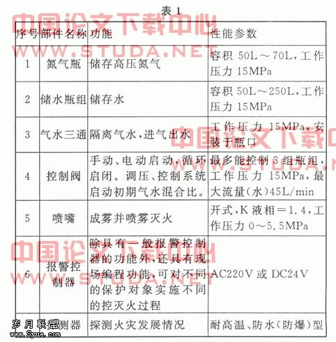 以气水同管高压两相流预作用细水雾系统为例(中、低压系统与其类似),系统由氮气瓶、储水瓶组、控制阀、瓶架、管道、喷嘴、报警控制器和探测器构成,各部件功能及主要参数见表1。