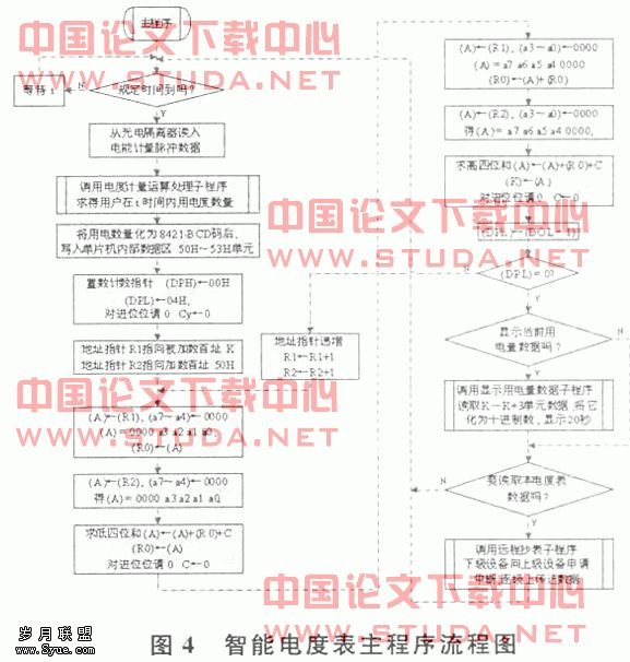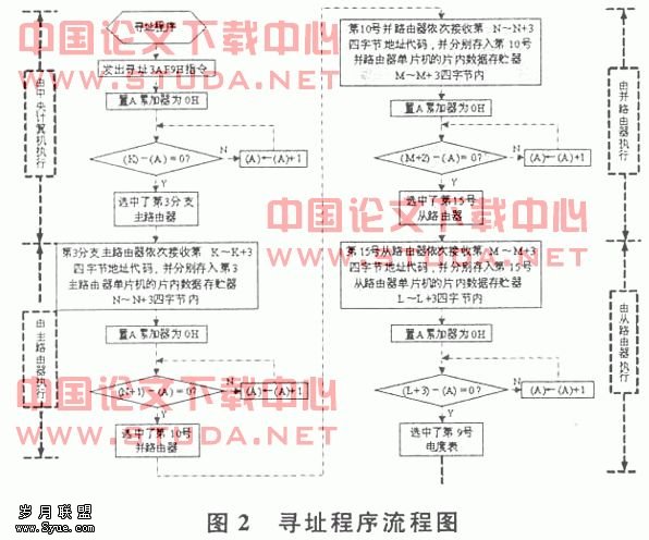 路由器:由图1知:路由器是中央计算机和智能电度表的“桥梁”。它是本系统一个专用的设备,类似“MODEN”,担负着“通讯”的任务。在本系统中共设置了3种路由器:主路由器、并路由器和从路由器。它们的原理、结构和功能基本上是相同的。图1左下角的虚框所示是从路由器的原理框图。与从路由器不同的是:主路由器、并路由器内的扩展口CD4067控制的继电器的“闸刀开关”则直接连接至下一级路由器。这样扩展口CD4067控制继电器“得电”工作时,主路由器则接通与继电器同一编码的并路由器,而并路由器则接通与继电器同一编码的从路由器。即系统连接时,都是按照图1所示连接它们的。这样,一个系统管理中心管理着16个(编号为0~15)主路由器;每个主路由器下接16个(编号为0~15)并路由器;每个并路由器又下接16个(编号为0~15)从路由器;每个从路由器下接16个(编号为0~15)智能电度表。如此,每一个主路由器为一分支。每一分支共用了263个路由器,可检测65536户智能电度表(用户)。16个主路由器分支,即一个远程抄表机系统用了4208个路由器,可检测1048576户智能电度表(用户)。正因为它们在系统中的连接方式不同,所以,它们执行具体的程序流程也不是完全相同的。