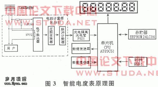 智能电度表是由电能计量器、光电隔离器、数据接收、发送器、EEPROM存贮器、时钟和7位数码显示器等组成。