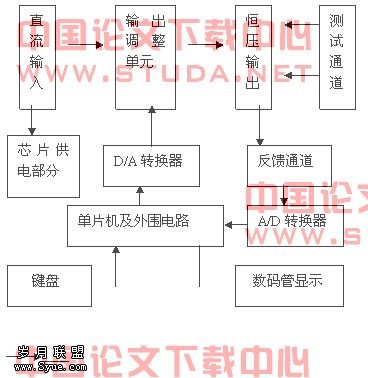 几乎所有的设备都需要稳定的直流电源,因此直流稳压电源的应用非常的广泛。 直流稳压电源的电路形式有很多种,有串联型、开关型、集成电路、稳压管直流稳压电源等等。在电子设备中,直流稳压电源的故障率是最高的(长期工作在大电流和大电压下,电子元器件很容易损坏)但在直流稳压电源中,通过整流、滤波电路所获得的直流电源的电压往往是不稳定的。输出电压在电网电压波动或负载电流变化时也会随之有所改变。电子设备电源电压的不稳定,将会引起很多问题。设计出质量优良的直流稳压电源,才能满足各种电子线路的要求。因此,直流稳压电源的研究就颇为重要。目前产生直流稳压电源的方法大致分为两种:一种是模拟方法,另一种是数字方法。前者的电路均采用模拟电路控制,而后者则是通过数字电路进行自动控制。直流稳压电源朝着数字化方向。因此对于数控恒压源的研究是必要的。随着技术飞速发展,对电源可靠性、输出精度和稳定性要求越来越高,利用D/ A 转换器的高分辨率和单片机的自动检测技术设计程控电源就显示出其优越性。程控电源既能方便输入和选择预设电压值又具有较高精度和稳定性,而且可以任意设定输出电压或电流,所有功能由面板上的键盘控制单片机实现,给电路实验带来极大的方便,提高了工作效率。