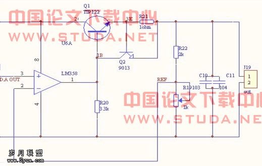 这部分将数控部分送来的电压控制字转换成稳定电压输出。D/A转换部分的输出电压作为稳压输出电路的电压。稳压输出电路的输出与参考电压成比例。稳压输出电路采用的是串联式反馈稳压电路(如图2),在电路中,Q1—TIP122为调整管,U6A—LM358 为比较放大器,R19、R22组成反馈。D/A转换电路的输出电压DAOUT接到 U6A 的同向端,稳压电源的输出经R19、R22组成的取样电路分压后送到运放U6A的反向端,经运放比较放大后,驱动调整管Q1。路平衡时,D/A电路的输出电压 与取样后的电压 相等。
