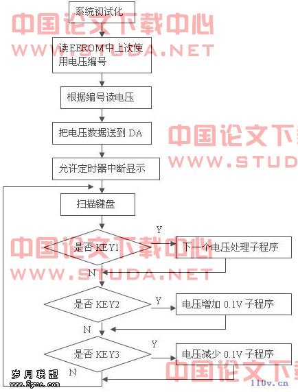 论文摘要:本系统以直流电压源为核心,AT89S52单片机为主控制器,通过键盘来设置直流电源的输出电压,设置步进等级可达0.1V,输出电压范围为0—9.9V,最大电流为330mA,并可由液晶屏显示实际输出电压值。系统有过流保护电路,当输出电流过大时功率管自动截至,而且有红色指示灯发出警报。本系统由单片机程控输出数字信号,经过D/A转换器(AD0832)输出模拟量,再经过运算放大器隔离放大,控制输出功率管的基极,随着功率管基极电压的变化而输出不同的电压。实际测试结果表明,本系统实际应用于需要高稳定度小功率恒压源的领域。