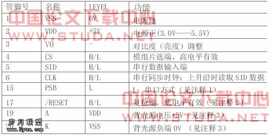4 | RS(CS) | H/L | RS=“H”,表示DB7——DB0为显示数据 RS=“L”,表示DB7——DB0为显示指令数据 |