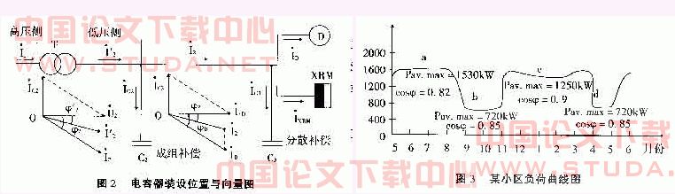 移相电容器在供配电系统中装设位置、低压成组补偿和分散补偿的电压与电流向量图。如图2。