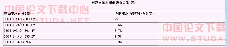 一些较早规划设计的居住小区供配电线路仍在较大的用电负荷状况下运行,用户终端的电压质量很差,单相电压降低到170V,日光灯启动受到影响,白炽灯发出昏暗的光线。锅炉引风、鼓风电机启动也十分困难,产权单位没有足够的资金进行技术改造。在这种情况下,可通过合理地选择变压器的分接开关,适当地提高配电线路的运行电压,就可以显著地降低线损。在带负载运行的条件下如能采用有载调压变压器自动地进行分级调压就更方便了。适当提高运行电压,可降低线路功率损耗。见表2。
