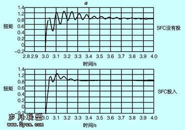 ,再经f3(s)即比例环节输出外扰电流的补偿量加到电流给定值中去,消除外扰影响。sfc投入前后动态加载时动态波形如图7所示。由图8所示sfc投入后连接轴在承受冲击负荷时,产生的扭振要比单纯双闭环控制系统有所改善,但并不能消除扭振。可以这么说,sfc是治标不治本。
