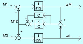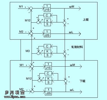 轧机的主传动系统是由若干个惯性元件与弹性元件组成的“质量弹簧系统”。r1上辊轧机的传动数学模型如图3所示。在稳定加载时,系统不会发生振荡;但在轧制负荷扰动下,“质量弹簧系统”会发生不稳定的周期性的扭振,扭振的频率就是质量弹簧系统的固有扭振频率。如果该固有频率与电气频率相吻合,整个传动系统处于不稳定状态,扭振状态的峰值转矩要比正常值大得多,加剧了扭振对传动轴系各部件的损坏。