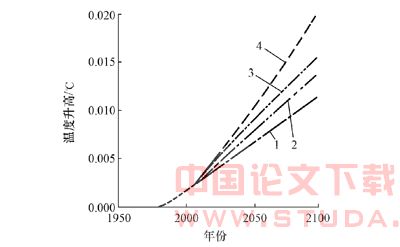 注: 曲线1、3是对SF6气体寿命为200年时温室效应的预测;曲线2、4是对SF6气体寿命为无限大时温室效应的预测。