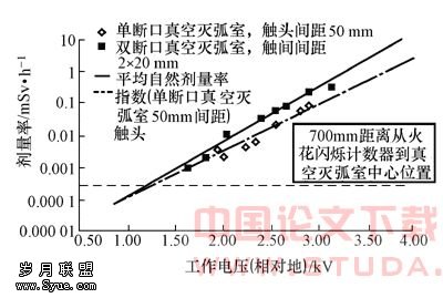 2002年,德国SIEMENS AG公司对84 kV的真空灭弧室在正常工作的情况下按国际标准火花闪烁计数器距离射线焦点700 mm位置对X射线的发射剂量率进行了测量,见图2[6],结论认为对人类的健康没有任何危害性。