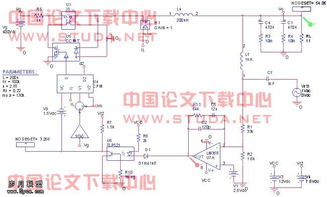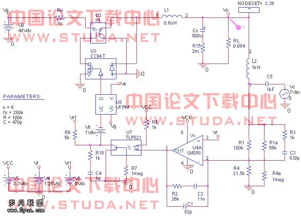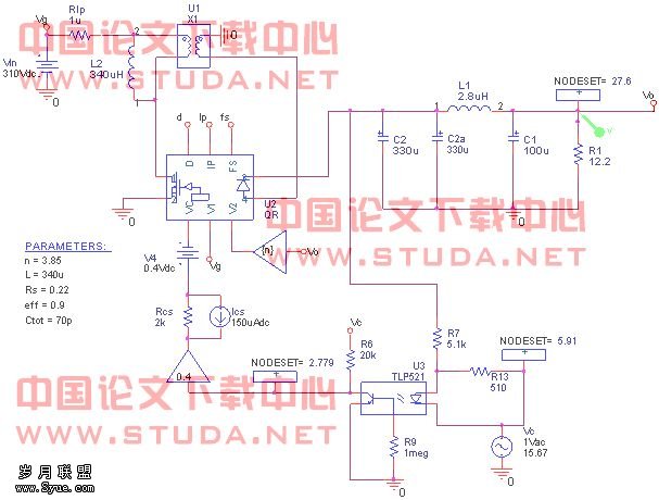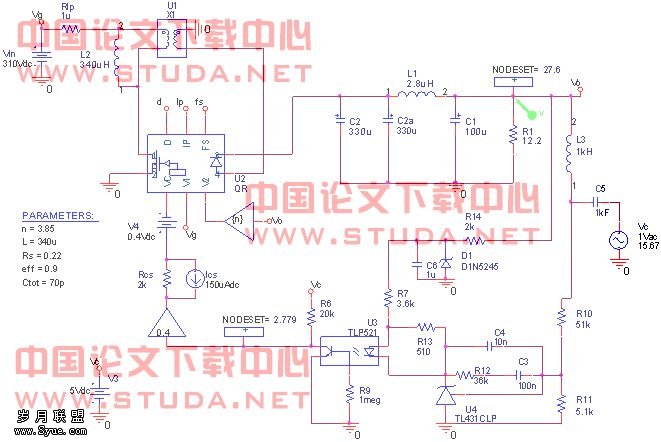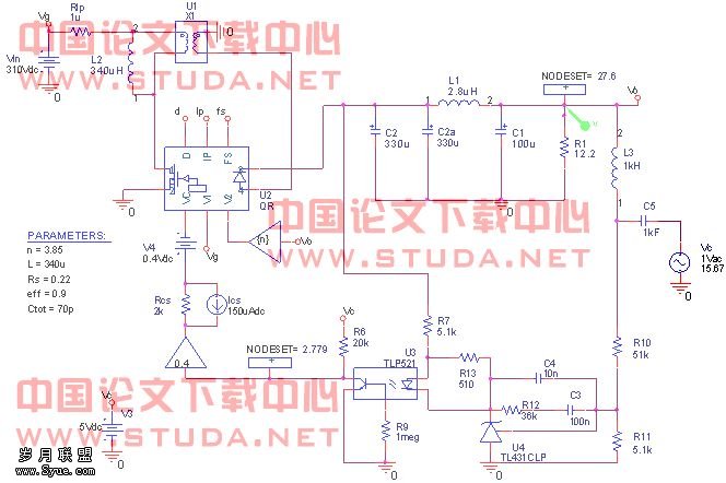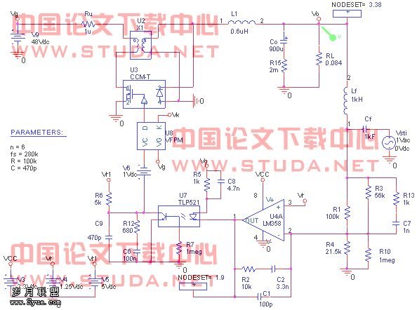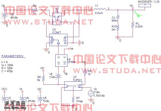 第三步:将补偿网络加入环路中,此时得到的电路就和实际的一样了。进行偏置点扫描(biaos point swip),得到电路各点的电压,与实际的测试结果比较,保证电路的参数设计合适,比如可以看看光藕的If是否合适。将环路中各器件设计到合适的工作点是保证电路在各种环境下稳定工作及长的工作寿命的前提。注意:补偿网络的参数不会影响电路的静态工作点。确定环路的静态工作点后,加入Lf、Cf及Vsti进行AC扫描,得到整个系统补偿后的开环传递函数T。