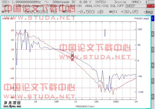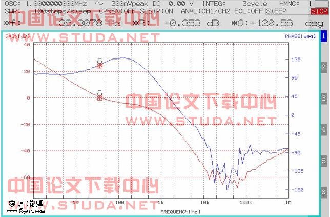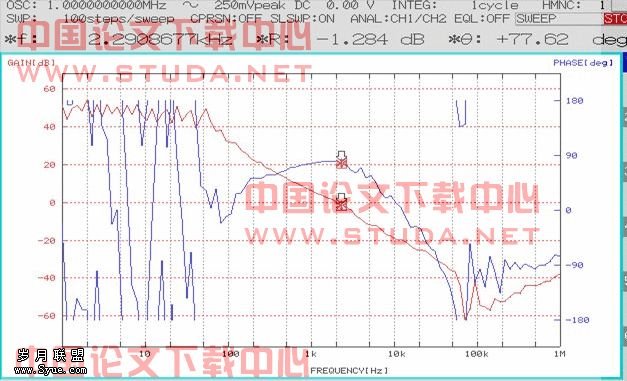 从仿真结果可以看出,交越频率fc处的相位裕度φm=66°,且频率低于fc的最低相位裕度也有36°,所以系统是稳定的。下面是实测的开环Bode图。