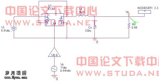 第一步:去掉补偿网络,对控制电压Vc(即补偿网络的输出)进行直流扫描,找到使Vo=3.3V时的Vc值,将Vc的直流分量设为次值,即设置了电路的静态工作点。