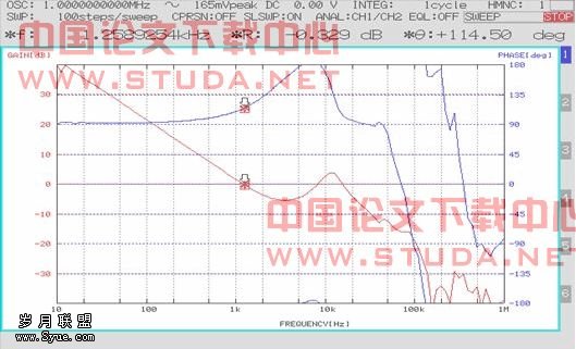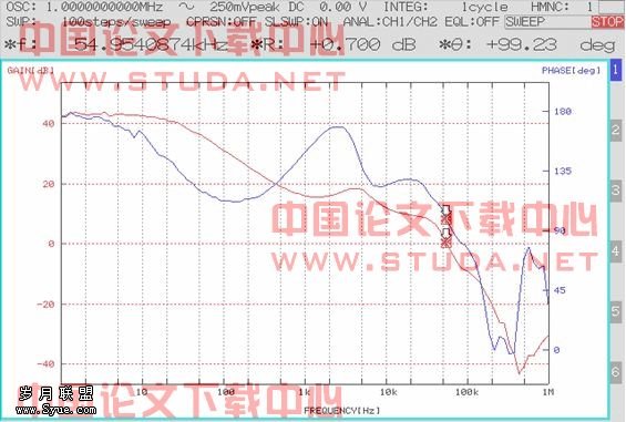 仿真结果:fc=24.7kHz, 相位裕度φm=43°。下面是实测的环路BODE 图。