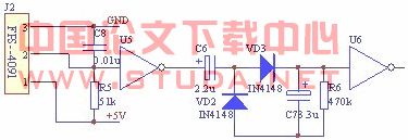 FPS—4091的输出信号经反向器放大、倒相后,经由VD2、VD3和C7组成的整流器电路整流、滤波后输出,可消除杂散的电磁干扰或瞬间接收到的红外光干扰信号。