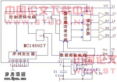 收到的串行数据从MC145027的第7脚输入,经数据提取电路判别后与序列发生器产生的本地地址 码一比特一比特的进行比较。如果第一次收到的地址码和本地地址码相符,则将紧接着收到的4位数据码储存在内部4比特移位寄存器中(不移到输出锁存器)。当第二次收到的地址码仍与本地地址码相符,则将新收到的数据码与上一次存储的数据码加以比较,若两次相同则控制逻辑电路使有效传输输出端VT为高电平。4比特移位寄存器中的数据码转移到输出锁存器,并且在输出锁存器保留,直到新的数据代替它。保留在锁存器的数据经缓冲器后输出,同时有效传输输出端VT保持高电平。若两次不相同或4个数据周期内没有收到信号,则VT为低电平。