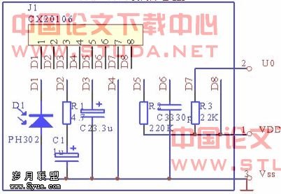 虽然在设计中我们采用的是FPS-4091芯片,但由于它是由CX20106组成的,所以还是有必要对CX20106进行一定的介绍。红外接收管PH302将光信号转换为电信号,从CX20106的第一脚输入,经前置放大器,限幅放大器放大后送至带通滤波器,带通滤波器的中心频率与红外发射载波频率相同。检波器,积分器组成的解调电路对接收信号进行解调。施密特触发器对解调信号进行整形,从第七脚输出,该输出为集电极开路电路,因此要接上上拉电阻R3,外围器件R1,C1的参数决定放大器的增益,当R1=4.7Ω,C1=1υF时,电压增益约为79dB,R1增大,C1减小则会使增益降低。R2确定带通滤波器的中心频率,调节R2可使F0的变化范围为30KHZ—60KHZ。C3是检波电容,一般取值为2.2υF—4.7υF。R3是上拉电阻,一般取值为1KΩ—3KΩ。