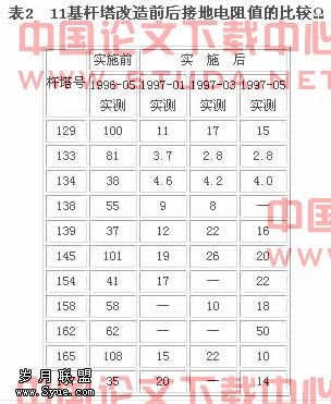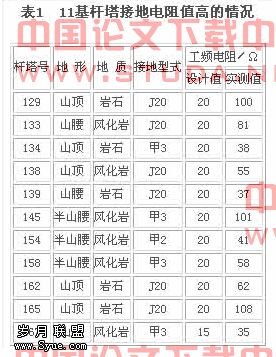 129号~167号杆中接地电阻值高的杆塔共有11基:129、133、134、138、139、145、154、158、162、165、167号,见表1。此段杆塔高山大岭占42%,一般山地占49%,平地占9%;我们对该段的接地进行了改善,重新埋设了接地引下线,对于接地土壤不好的采取了换土措施,较严重的采取了埋设连续伸长接地体的措施,工程实施后输电杆塔的接地电阻有了明显的降低,如表2所示
