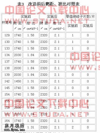 对于这一段线路中所有的零值瓷瓶进行了更换,并且对所有的直线杆塔(保证对地距离足够的条件下)每相增加一片绝缘子,改为采用8片XP-7绝缘子。实施后的绝缘子爬电距离(下称爬距)、泄漏比距(下称泄比)与实施前的对照表参见表3,从表中可以明显看到线路的绝缘水平有较大幅度的提高。