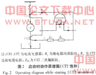 (2)电动机启动时:原理图见图2,由于电动机启动电流较大,是额定电流的6~8倍且含有较大的非周期分量。当TA1与TA2特性存在差异或剩磁不同,如有一个CT先饱和。假设TA2先饱和,TA2的励磁阻抗减小,二次电流i2减小。由于 ij=i1-i2 导致ij上升,继电器两端电压Uab上升。这样又进一步使TA2饱和,直至TA2完全饱和时,TA2的励磁阻抗几乎为零。继电器输入端仅承受i1在TA2的二次漏阻抗Z02和连接电缆电阻Rw产生的压降。