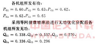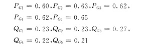 (1)在五台发电机组中,第三台机组不参与无功调节,当采用等网损微增率法进行无功优化时,第二、第五台机组无功越上限,故均取为上限值。而采用EP法进行无功优化时五台机组均未越限;