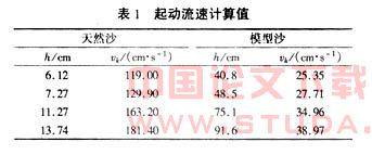 式(4)的天然沙和模型沙的起动流速见表1,起动流速比尺与模型律所要求的流速比尺基本一致.