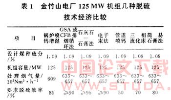 根据相关资料计算出金竹山电厂125 MW机组在燃煤含硫1.09%时的几种脱硫技术经济比较结果见表1。其中机组年运行小时为5 000 h,年脱除二氧化硫单位投资按20 a计算(以下相同)。