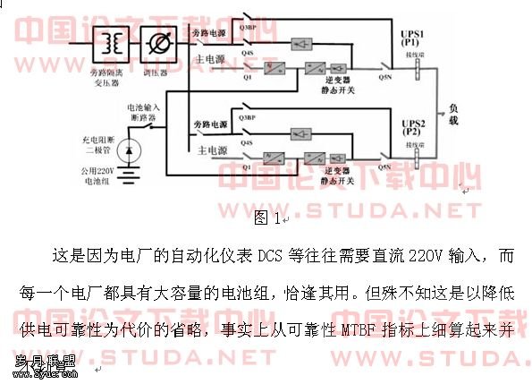 为了提高供电的可靠性,电厂中通常是采用两台UPS组成1+1冗余系统为负载供电,并配之以隔离变压器、交流电压调节器作为旁路电源输入。但是UPS的电池组往往被省略,直接将UPS的直流端接入220V的公共直流母排,如左图1:
