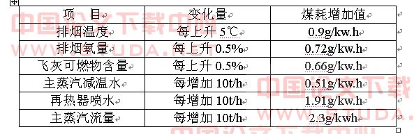 以上及分析数据得到锅炉各重要指标对煤耗的影响情况如下表: