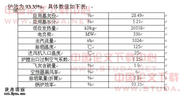 基准工况:根据热工院1#炉燃烧调整和性能考核试验参数,煤质取设计煤种、参数取额定参数、飞灰含碳量取1%、空预器漏风率取6%、计算炉效为93.35%,具体数值如下表: