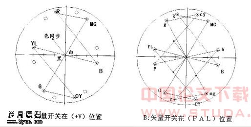 电源接通,仪器预热,辉度适中,不宜过亮。调水平位移和垂直位移。使光点位于V轴和U轴的交点上。用电视信号发生器输出标准彩条信号,经电缆线接至CH-A的一个插座上,另一个插座必须接上一个75Ω的终端负载(或经电缆线接至另外一台视频仪器的环通输入端)。转动移相器,使色同步为135°、225°的矢量点与示波管刻度座标上的色同步矢量刻度相重合,此时仪器显示出被测信号的矢量图如图2B,即PAL行和NTSC行各色矢量图。再按一不PAL/+V键,+V灯亮,此时显示转为NTSC显示方式,即PAL行倒相后和NTSC行重合显示,如图2A。通过调节“移相器”,使图形重合最佳。