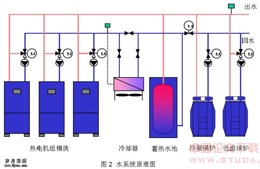 项目向用户供电、采暖、供生活热水、供游泳池热水和夏季供冷。系统以天然气和燃油为燃料,以模块化的燃气热电机组作为发电设备和供热设备;燃油燃气锅炉作为辅助热源,在热电机组产热不足时,投入使用;设置了紧急蓄热水池,热电机组产热量大于用户热负荷时,蓄纳多余的热量;另外设置冷却器,在热电机组给水温度过高时,投入使用,降低热电机组给水温度。整个系统全部采用自动化控制,中央控制器根据用户的负荷需求,控制设备的运行,通过调节各设备入口处的电动阀来实现最佳的运行工况,使系统效率达到最优化。下图为水系统原理图。
