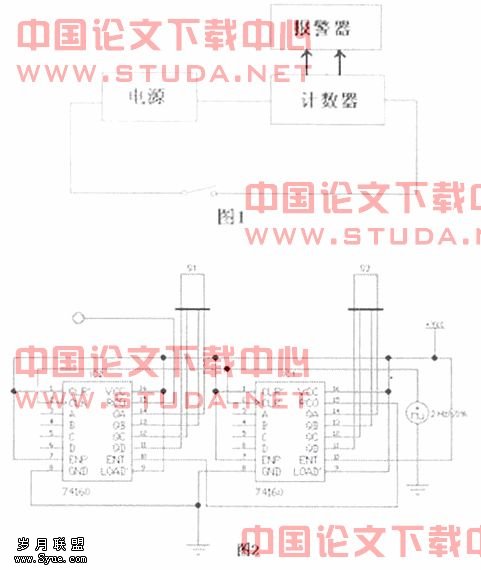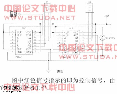 这是整个电路的设计关键。利用计数器作为控制单元有两大优点:第一,电路容易实现,可以利用现有的数字电路集成芯片。第二,对计数器设计不同的时间,可以根据需要设置报警提示的时间。
