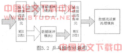 其中控制寄存器保存带通滤波的滤波器表索引号,详见下面带通滤波器设计部分。双口SDRAM负责存储外部输入的原始数据及经过FFT&IFFT运算后的中间数据。图像输入模块,双口RAM,控制逻辑三者之间采用乒乓操作模式,如图3.2所示。FFT/IFFT模块在实际实现的时候采用同一模块来实现。