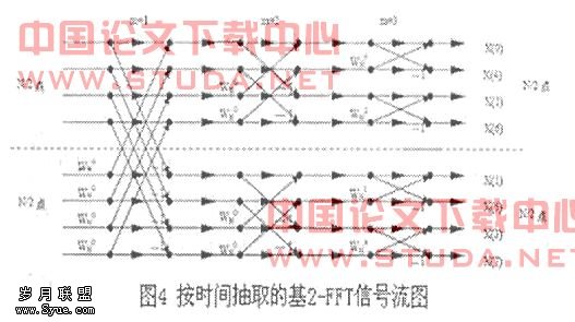 提高FFT速度的两个主要途径是采用流水结构和并行运算,采用高基数结构也可以提高速度,只是用FPGA实现时必须综合考虑系统要求、结构特点及片内资源。针对本系统自身特点,这里按时间抽选算法进行分析。本系统采用基-2DIT行列算法。